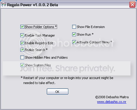 Đột nhiên Task Manager bị vô hiệu hóa (bị mờ) và bạn không thể mở nó được bằng cách click chuột phải lên taskbar, không thể mở Folder Options, không thể hiện file/folder bị ẩn, không thể mở Windows Search,… Đây là một số hậu quả do virus để lại sau khi tấn công máy tinh của bạn. Ngay cả khi bạn diệt hết virus, những tính năng này vẫn bị vô hiệu hóa. Phần mềm Regain Power sẽ giúp bạn giành lại quyền kiếm soát những tính năng bị vô hiệu hóa đó.