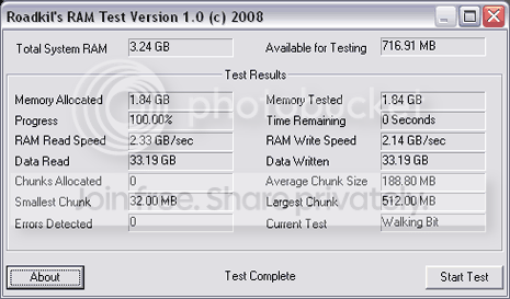 Bạn có muốn kiểm tra và đánh giá đặc tính của RAM trên máy tính không? Roadkil’s RAM Test là tiện ích portable miễn phí giúp kiểm tra đặc tính hoạt động của bộ nhớ được cài đặt trên máy tính. Phần mềm này kiểm tra lỗi cũng như tốc độ đọc, ghi dữ liệu của RAM.